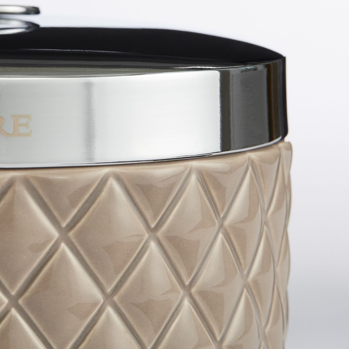 Ekskluzywny, ceramiczny słoik o wzornictwie harlequin i srebrnej pokrywie ze stopu cynku. Doskonale nadaje się do przechowywania niewielkich przedmiotów w łazience, gdzie będzie jednocześnie praktyczny i dekoracyjny. Użyj go do biżuterii, płatków bawełnianych, lub czegokolwiek chcesz.
