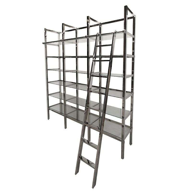 • Regał metalowy ze szklanymi półkami, relingiem i drabiną.