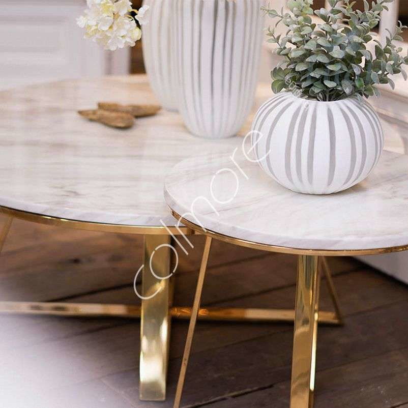 • Stolik kawowy w złotym kolorze, z marmurowym białym blatem.
