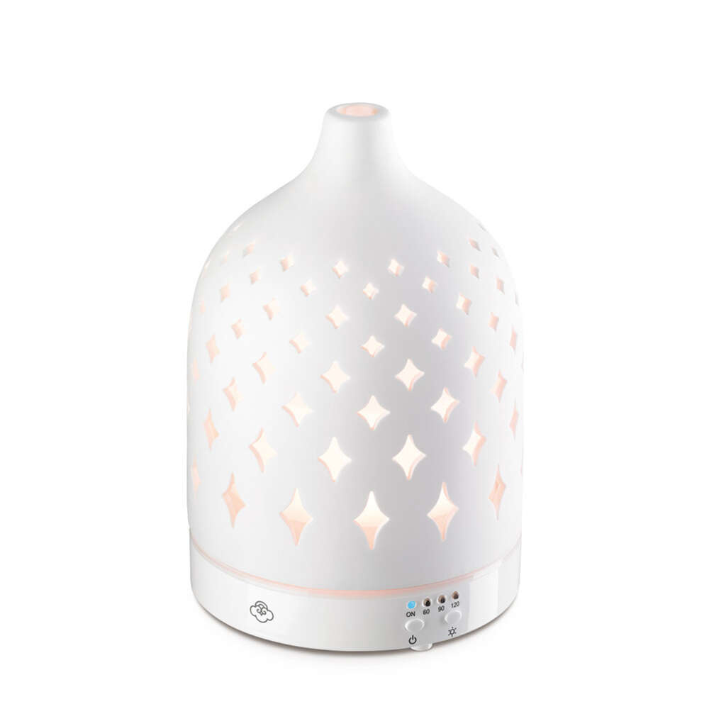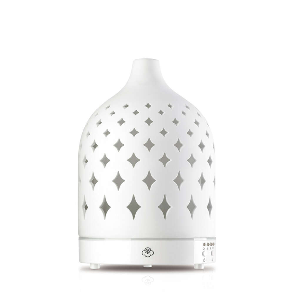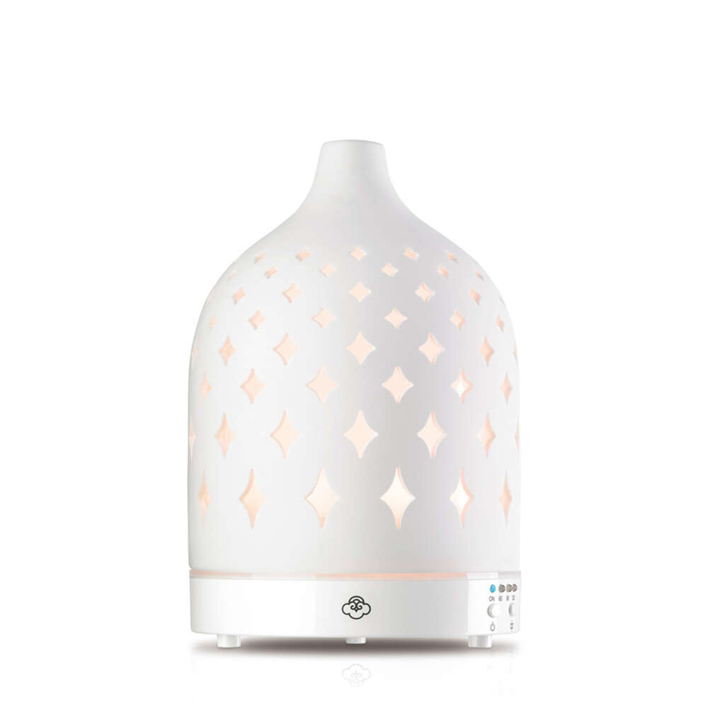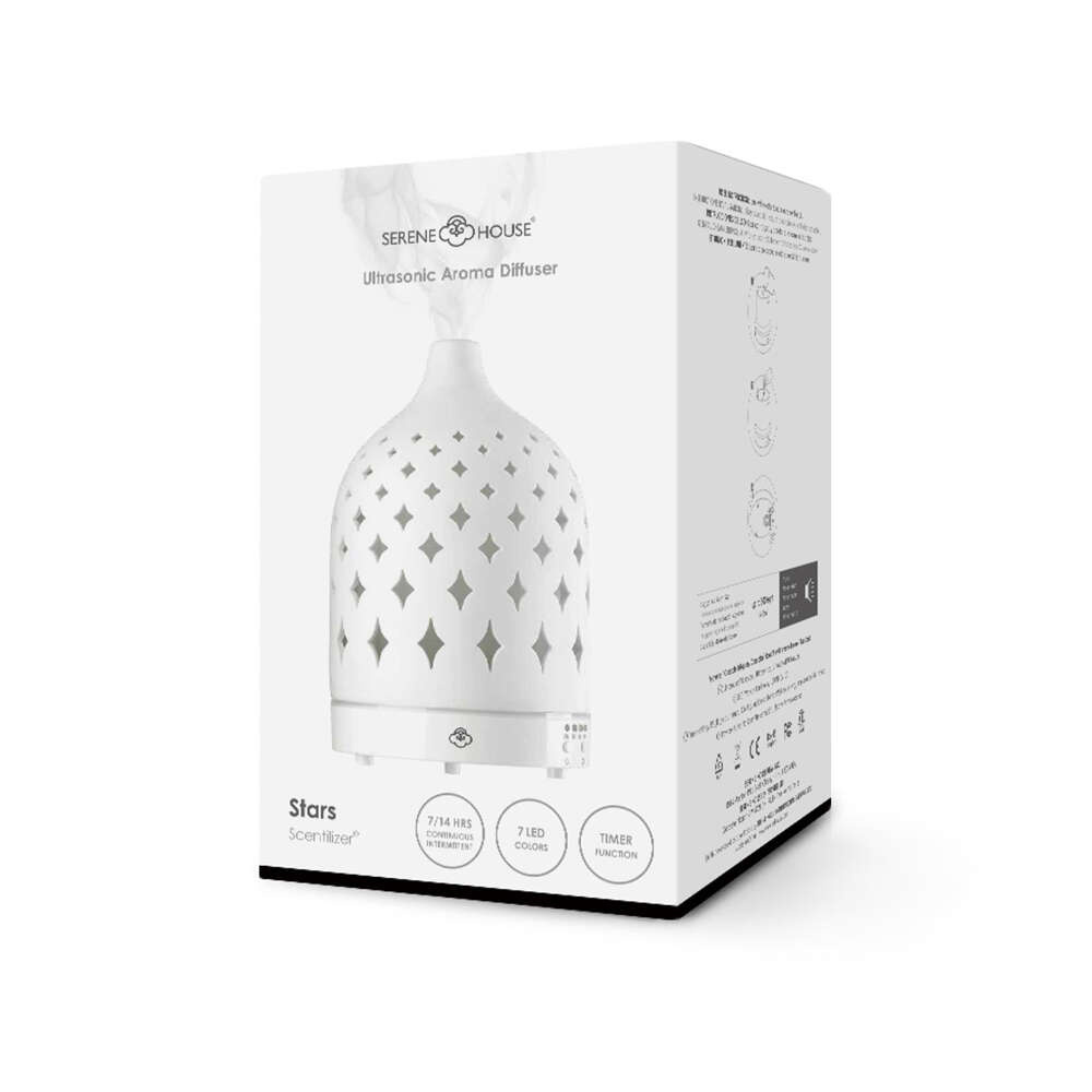 Pięknie zaprojektowany elektryczny dyfuzor aromaterapeutyczny oferuje nowy sposób na wypełnienie przestrzeni wybranym przez nas zapachem. Szczegółowa ceramiczna pokrywa naszego dyfuzora Stars doda wyrafinowanego akcentu każdemu pomieszczeniu. Stars posiada 7 obrotowych świateł LED i działa do 7 godzin nieprzerwanie lub do 14 godzin z przerwami. Wystarczy dodać wody i olejku eterycznego, włączyć i pozwolić chłodnej mgiełce się zrelaksować i naładować.