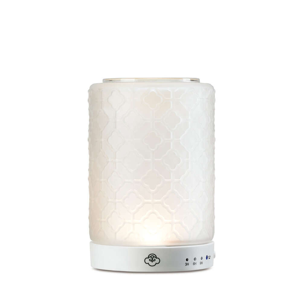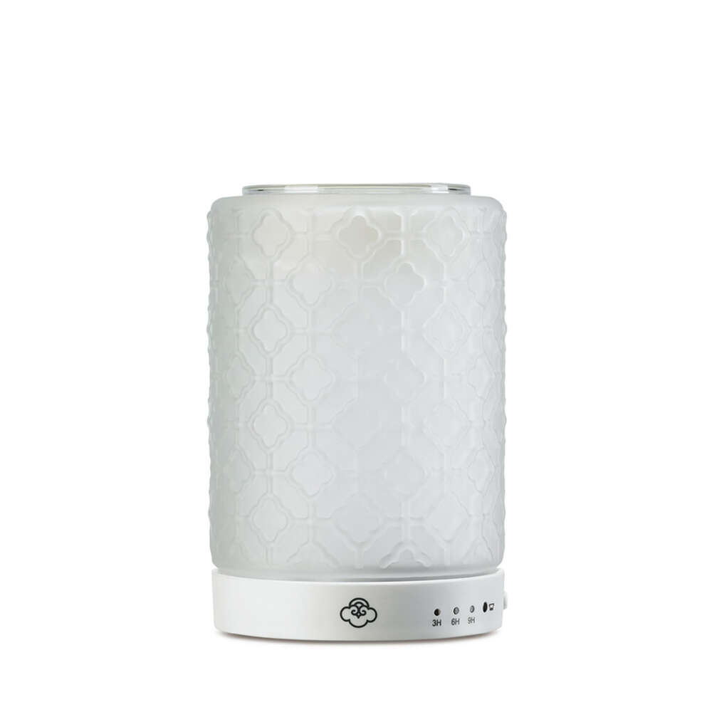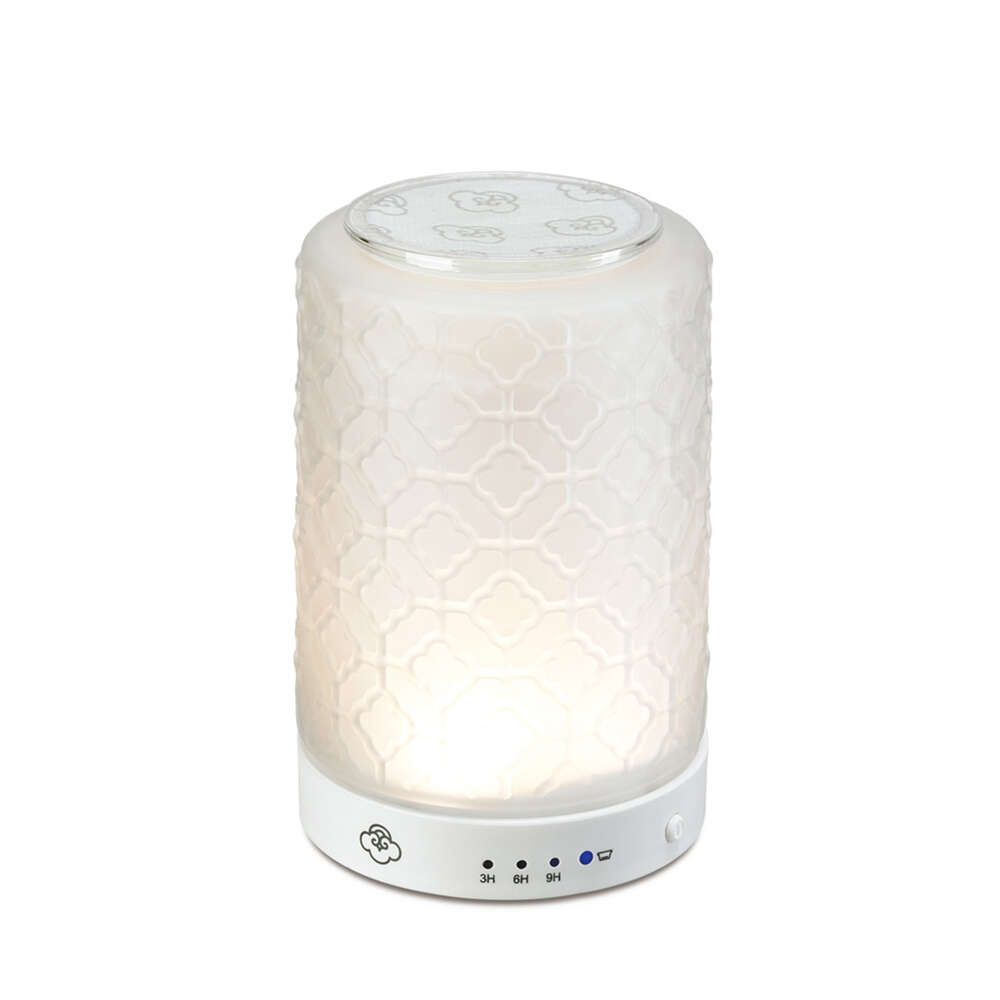 Lace White No Spill Wax Warmer to szklany podgrzewacz do wosku o pięknym designie. W zestawie zasilacz sieciowy i USB. Bezpieczny i nie rozlewa się, jeśli jest używany z Serene Pod, łatwa zmiana zapachu, światło LED dla nastroju lub lampka nocna.
