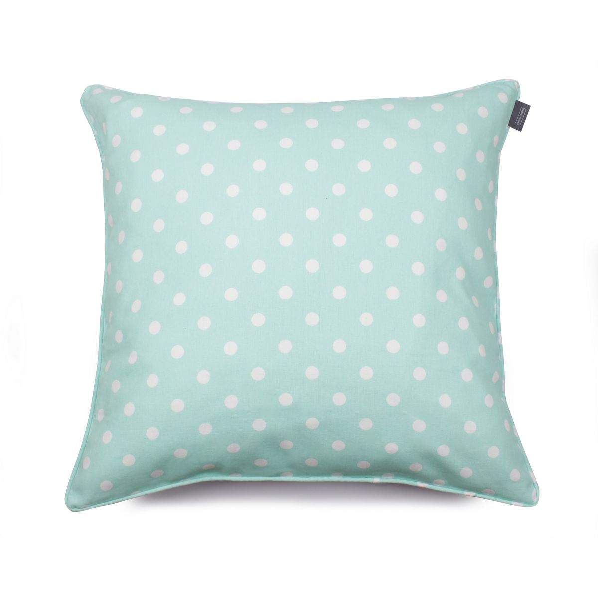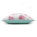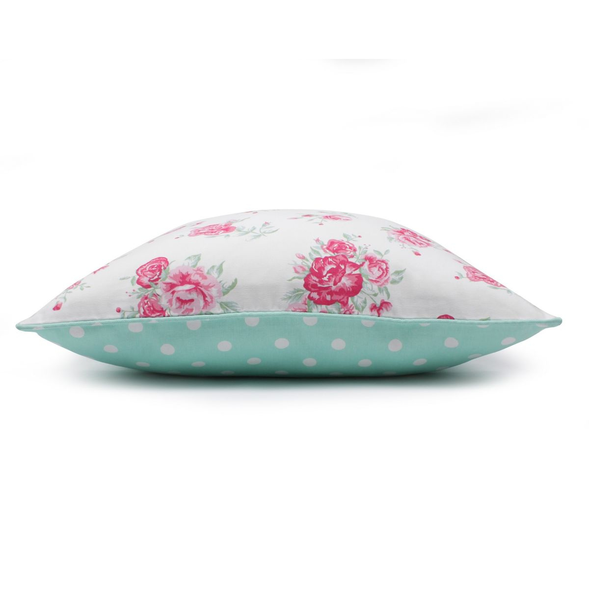 • Poduszka dekoracyjna w pięknym deseniu w róże ogrodowe, oraz wesołe białe groszki na miętowym tle z tyłu.