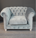 • Fotel na drewnianych nogach, pikowany guzikami z ozdobnikami.
